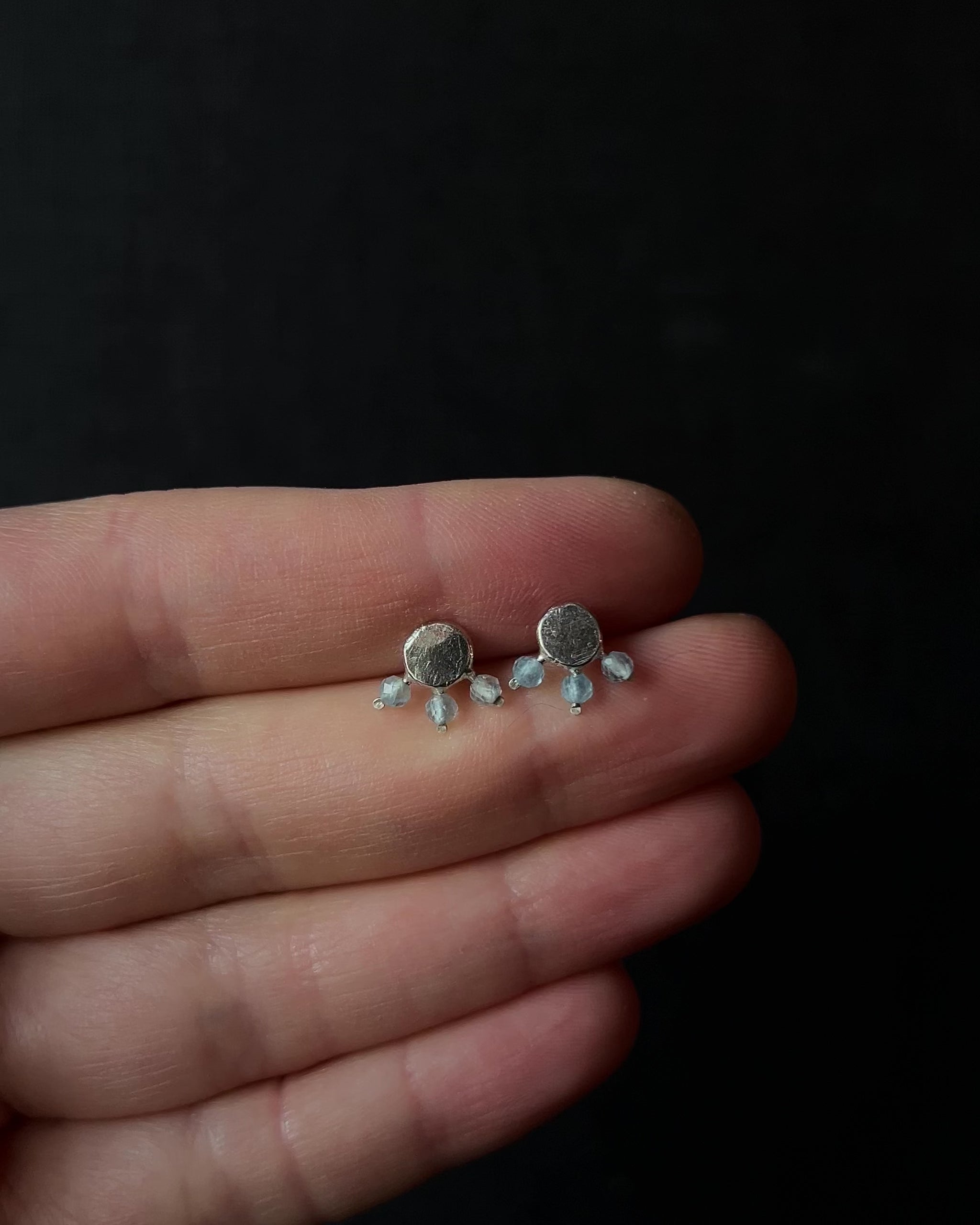Rhea stud earrings are defined by a quiet centre, surrounded by one to four stones arranged in a soft, circular rhythm. The lightly hammered silver carries a timeworn feel, giving the pieces an almost antique presence without feeling heavy or ornate. Pearls and coloured beads add subtle variation, each combination slightly different from the next. Small, expressive earrings designed to be worn close and often.