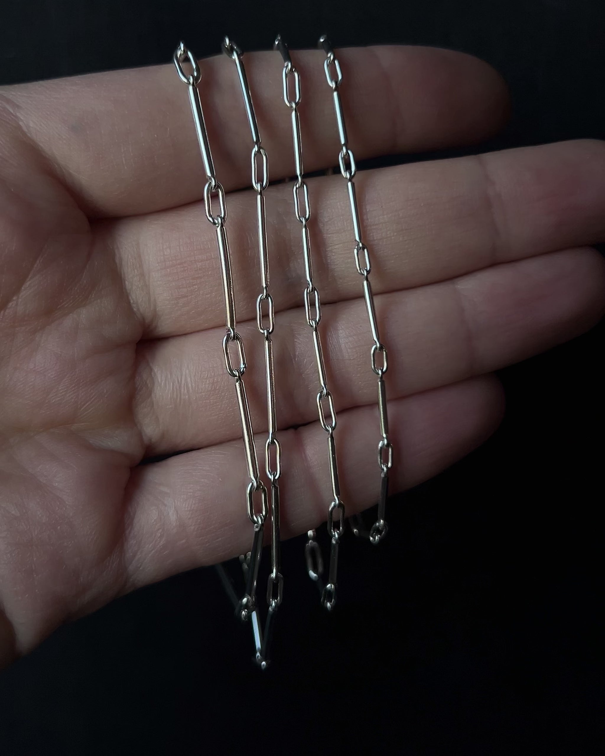 This bar link chain bracelet is made in-house, from scratch, with attention to proportion and movement. The elongated links create a clean, understated structure with a subtle sparkle as it moves on the wrist. Minimal in design, yet it carries a quiet edge that doesn’t go unnoticed. Easy to style, it works just as well worn alone as layered with other pieces.