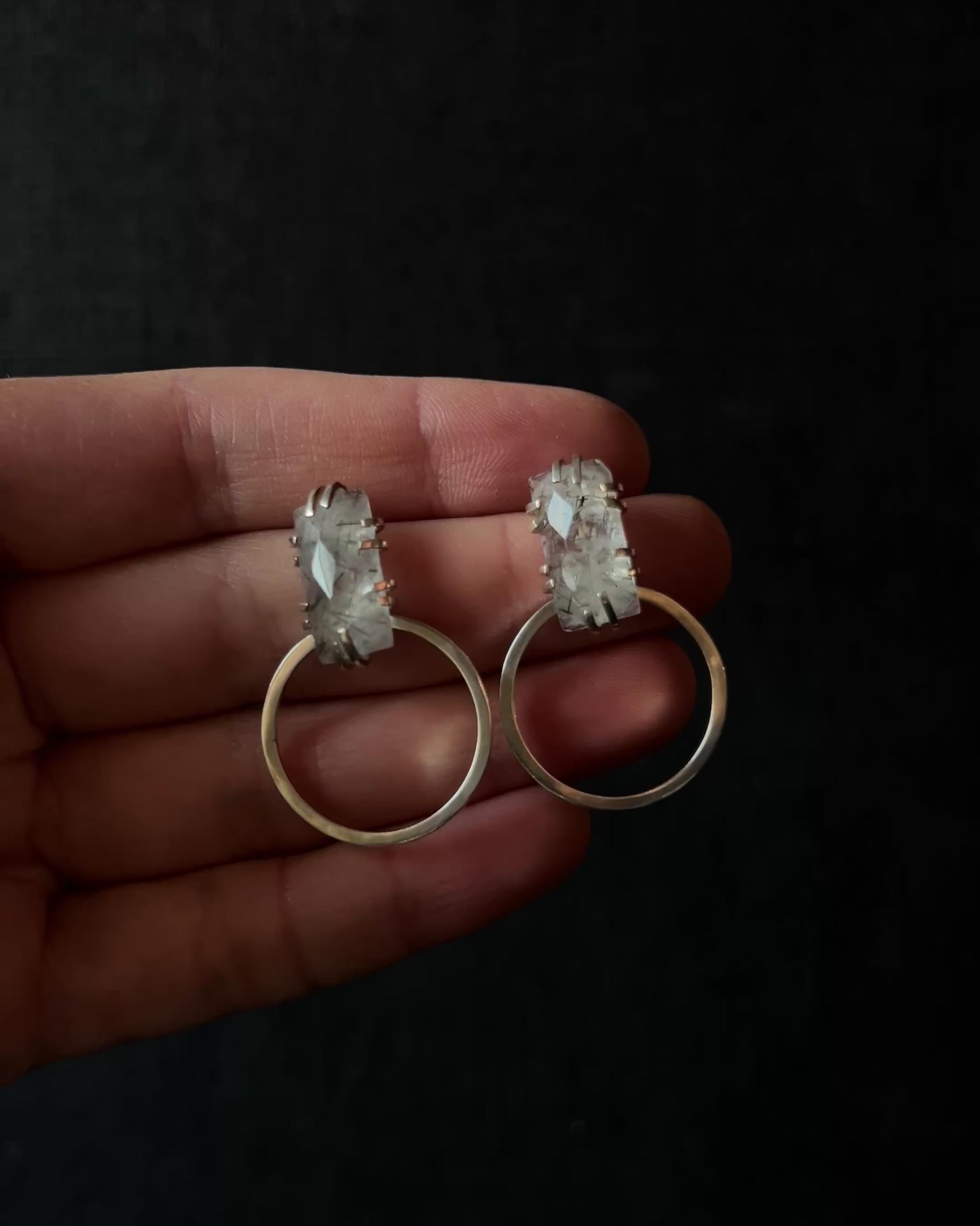 Black rutile quartz earrings with rose-cut stones that echo a subtle vintage mood. The quartz is held in an intentionally uneven claw setting, giving the piece a worn-in, time-touched character rather than polished perfection. A freely moving silver circle hangs below, adding soft motion and contrast. Refined yet slightly off-beat — modern talismans with a quiet sense of history.
