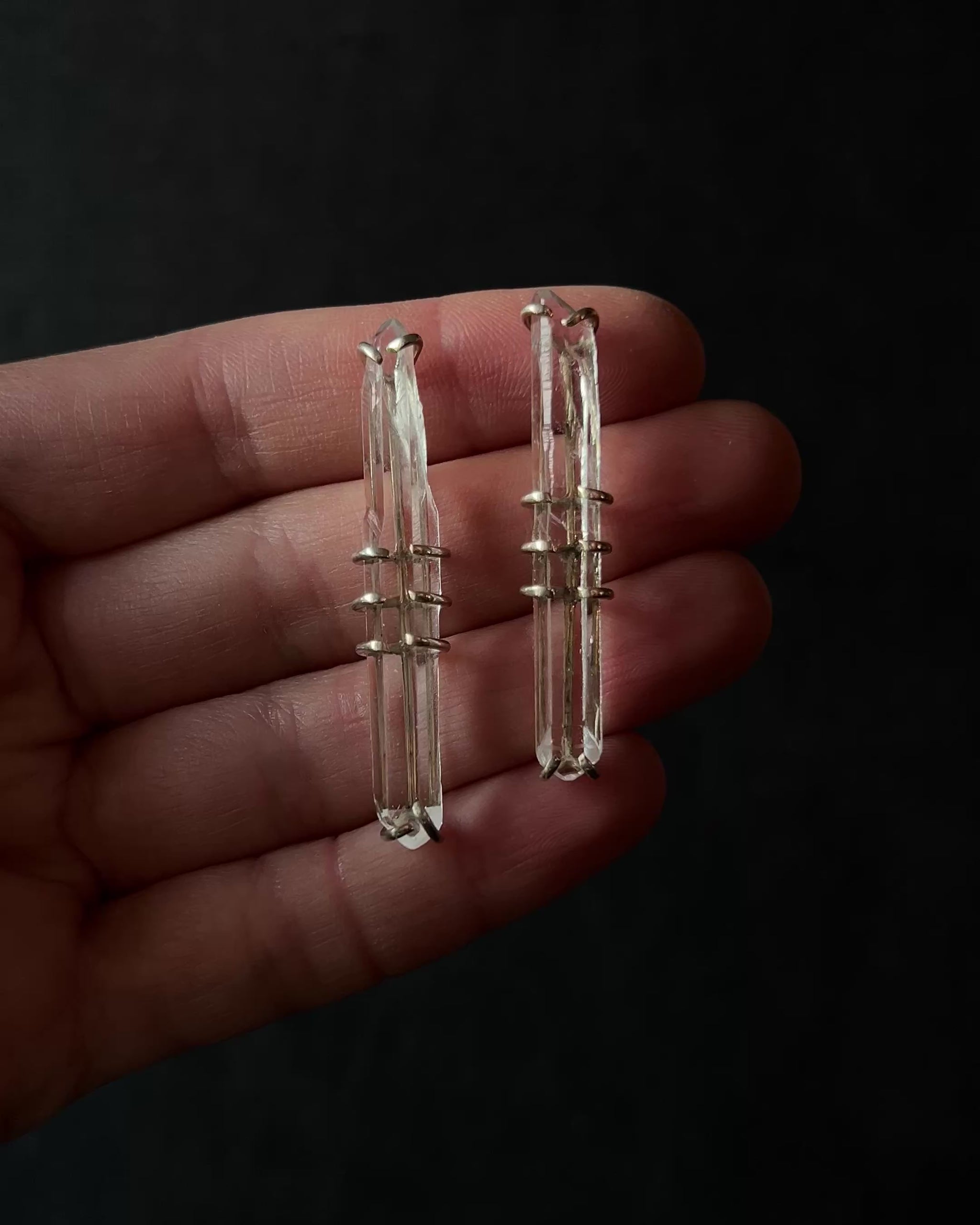 Elongated skeleton quartz earrings that feel like fragments of something ancient and alive. The crystals reveal natural growth patterns and inner fractures, held in a minimal silver structure that lets their raw form take the lead. Light moves through them quietly, revealing depth rather than sparkle. Worn as subtle statements — modern talismans with a sharp, ethereal edge.
