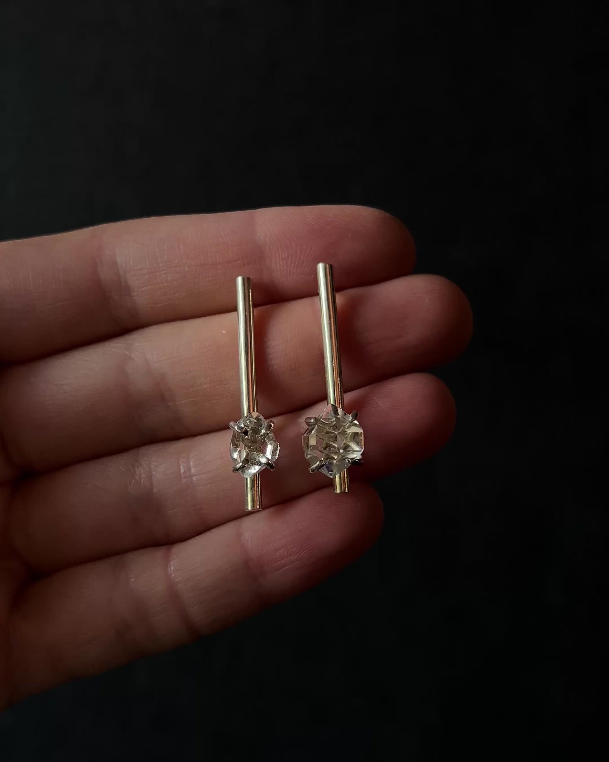 Clean silver lines end with a single Herkimer diamond, set in a classic four-claw setting that gives the stone space to catch the light. The straight, architectural form contrasts with the raw sparkle of the crystal, creating a quiet tension between structure and glow. Minimal but intentional — pieces that feel grounded, luminous, and effortlessly modern.