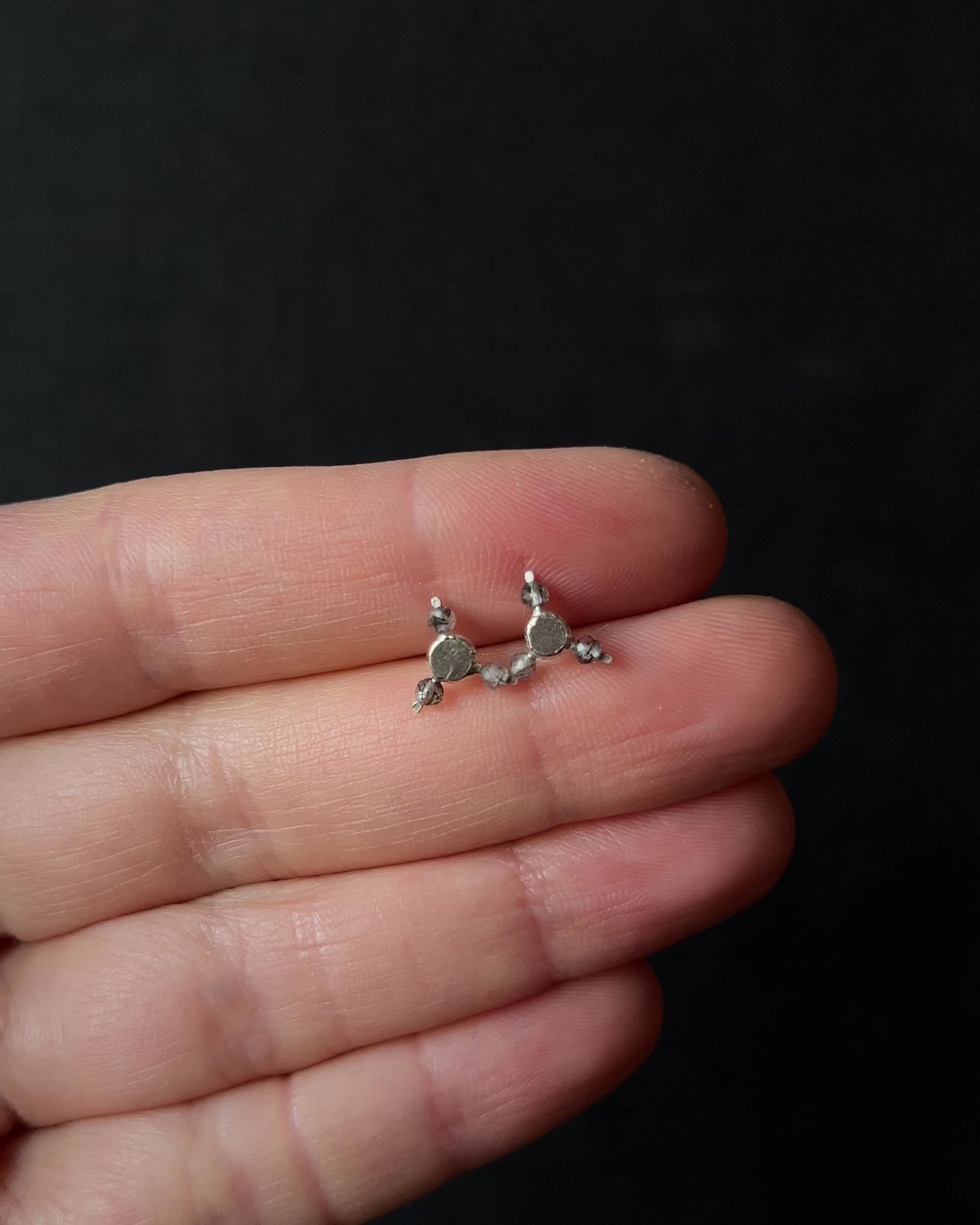Rhea stud earrings are defined by a quiet centre, surrounded by one to four stones arranged in a soft, circular rhythm. The lightly hammered silver carries a timeworn feel, giving the pieces an almost antique presence without feeling heavy or ornate. Pearls and coloured beads add subtle variation, each combination slightly different from the next. Small, expressive earrings designed to be worn close and often.