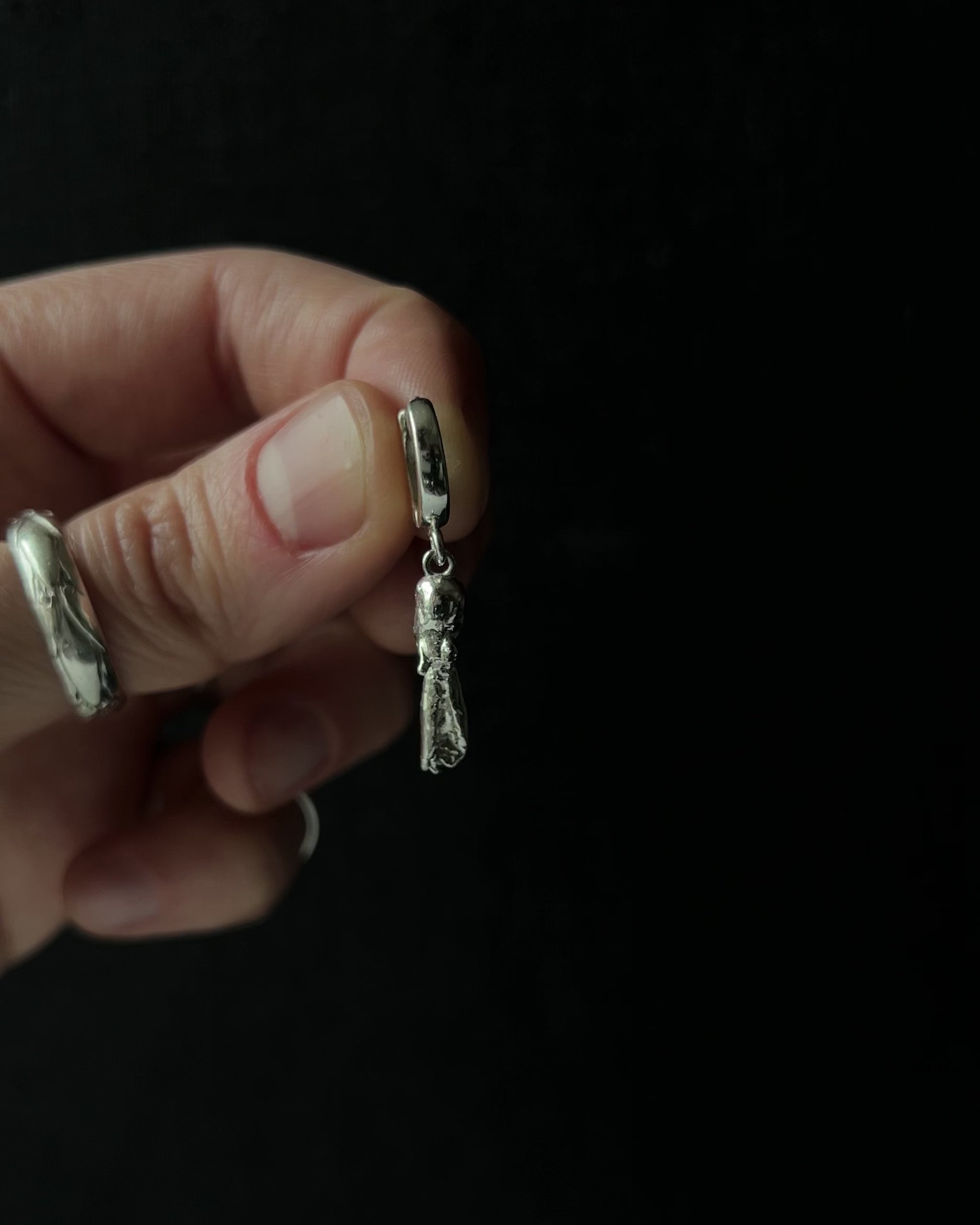 This dangle has a more fluid, three-dimensional form, shaped like an uneven drop of molten metal. Sculptural and slightly raw, it catches light differently from every angle. A subtle statement with depth.