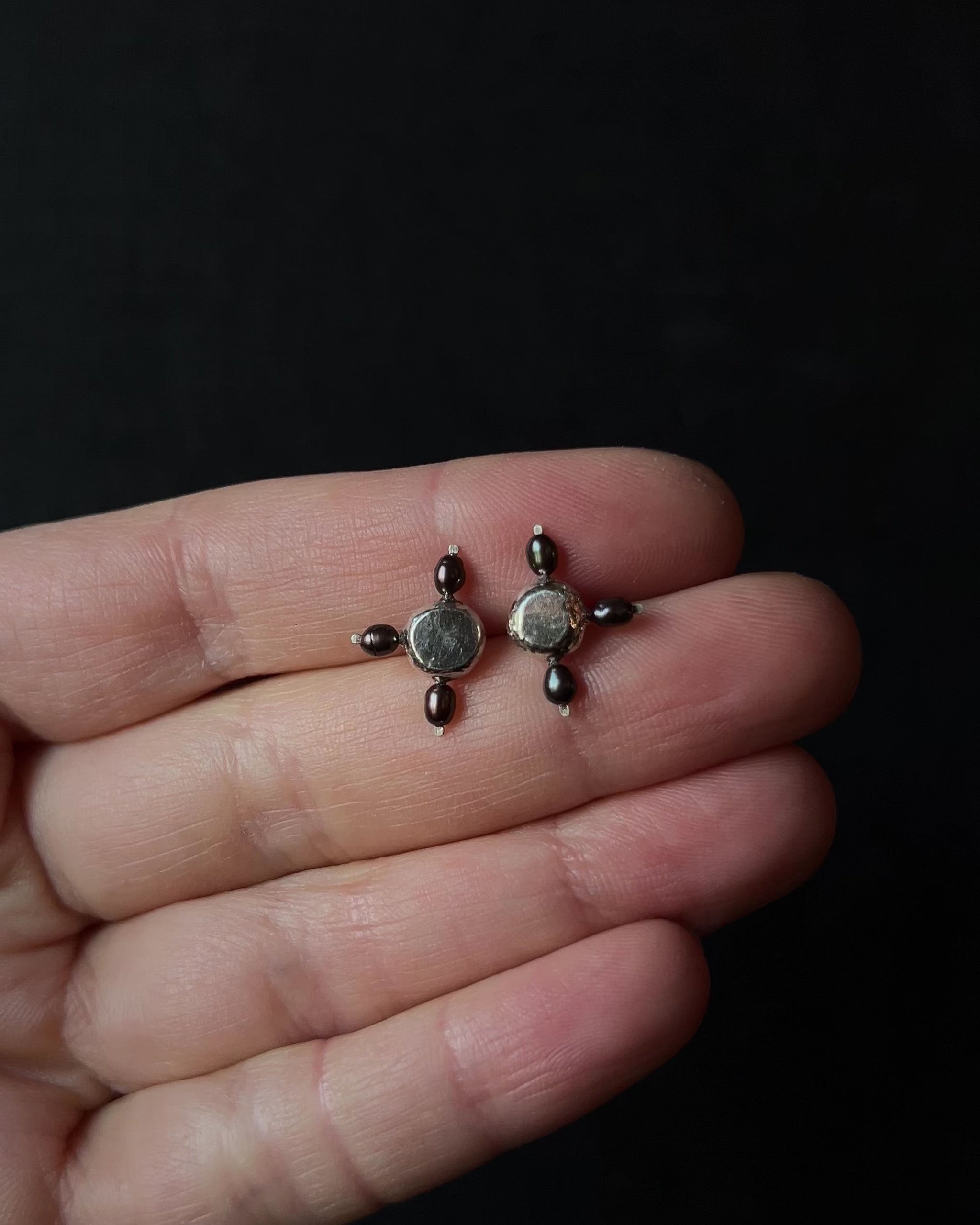 Rhea stud earrings are defined by a quiet centre, surrounded by one to four stones arranged in a soft, circular rhythm. The lightly hammered silver carries a timeworn feel, giving the pieces an almost antique presence without feeling heavy or ornate. Pearls and coloured beads add subtle variation, each combination slightly different from the next. Small, expressive earrings designed to be worn close and often.