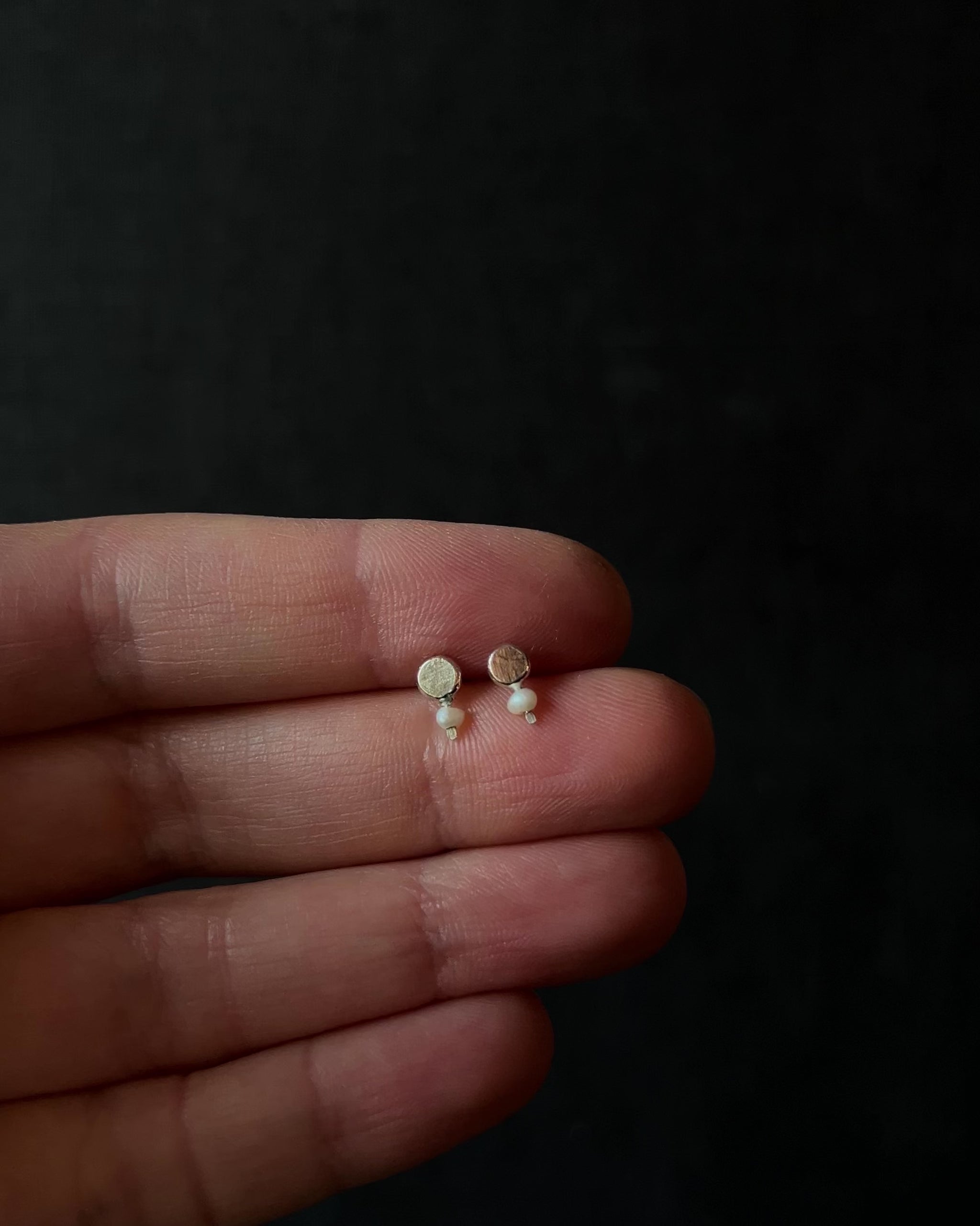 Rhea stud earrings are defined by a quiet centre, surrounded by one to four stones arranged in a soft, circular rhythm. The lightly hammered silver carries a timeworn feel, giving the pieces an almost antique presence without feeling heavy or ornate. Pearls and coloured beads add subtle variation, each combination slightly different from the next. Small, expressive earrings designed to be worn close and often.