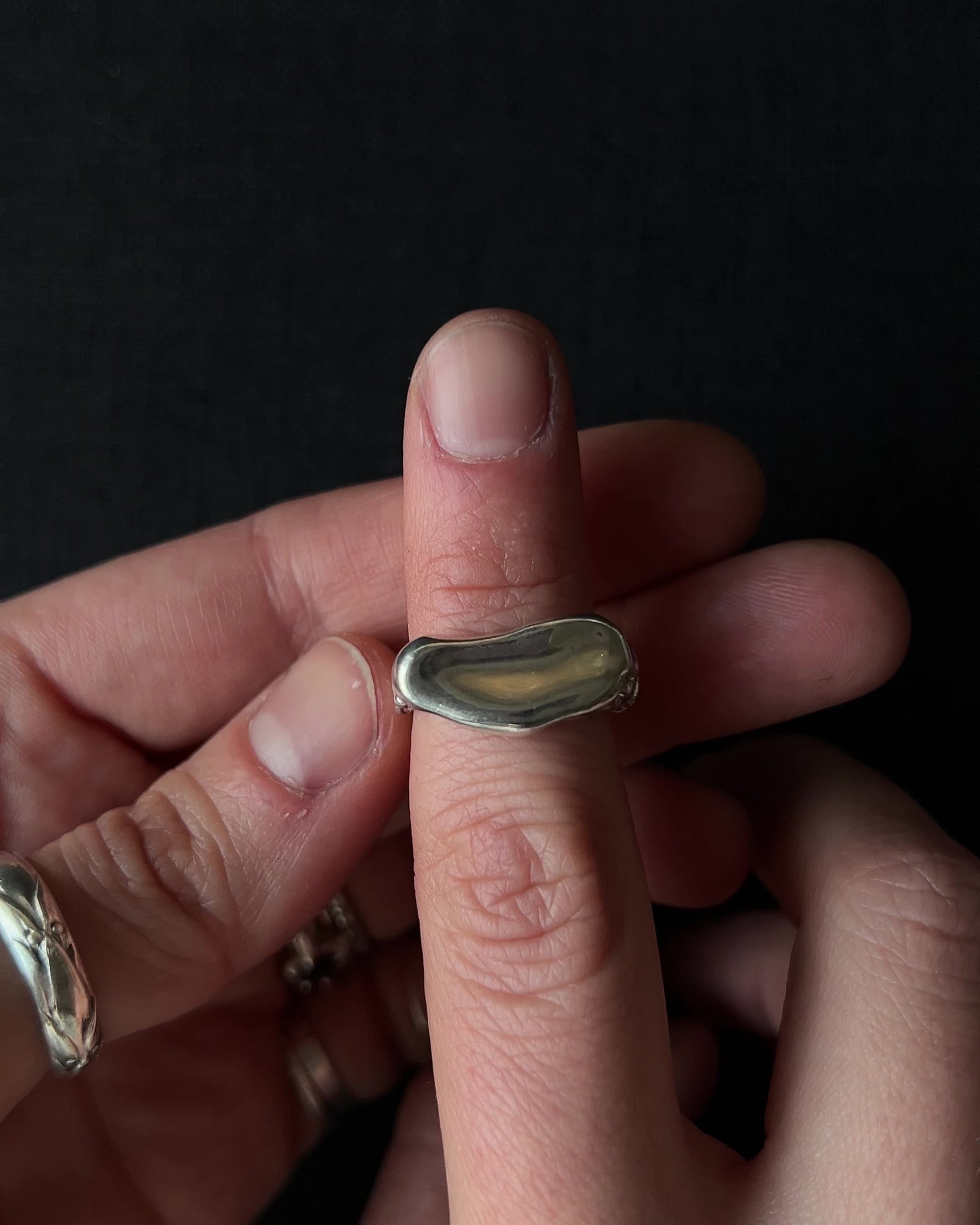 This signet ring is defined by a molten texture that gives the classic form a raw, contemporary edge. The surface remains intentionally imperfect, allowing the ring to feel strong without being loud. Minimal in design, yet grounding when worn. A modern staple with character.