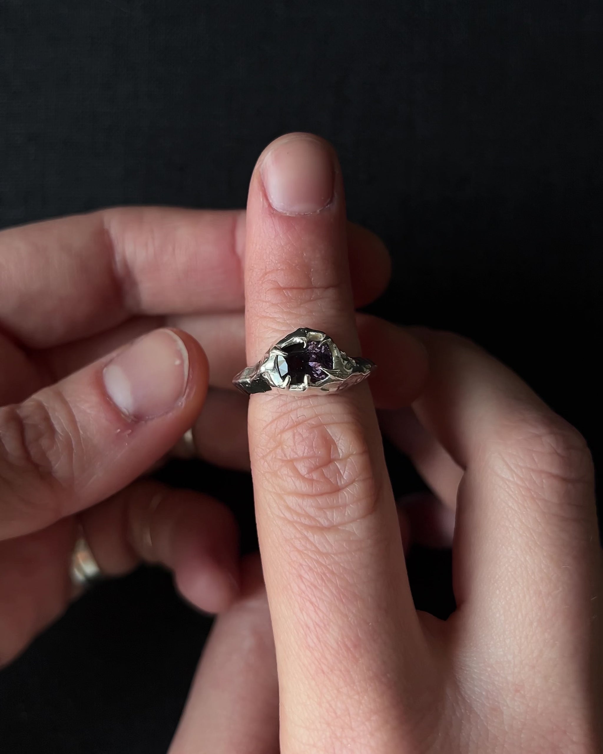 This ring centres around a violet spinel, held in a setting shaped by molten, irregular silver. The band flows organically around the stone, giving the piece a raw, almost worn-in character. The contrast between the deep violet hue and the fluid metal keeps it expressive without feeling decorative. A statement ring with a grounded, modern edge.