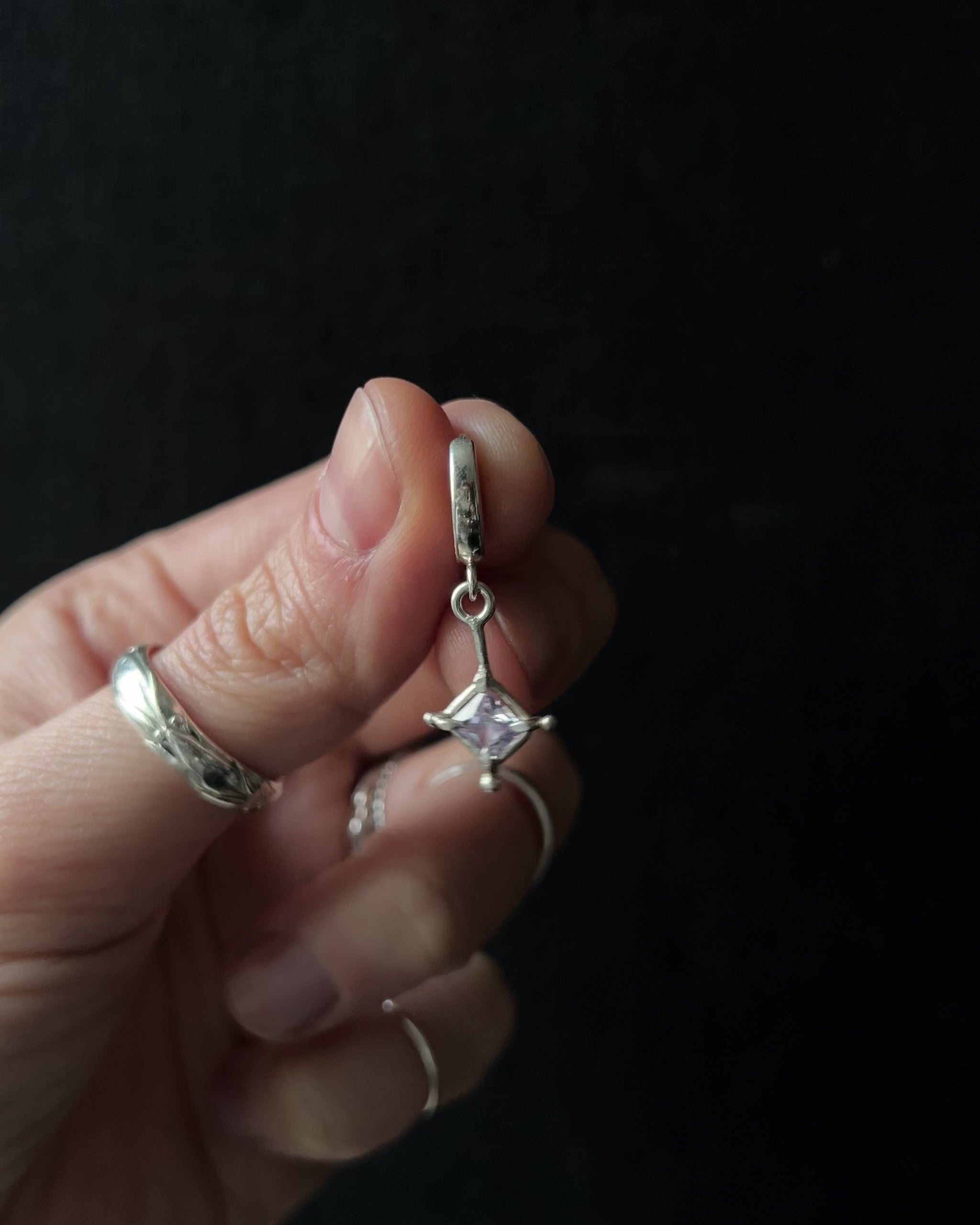 A square lilac CZ in a slightly elongated setting, designed to sit lower on the hoop. The added length makes it ideal for ears with multiple piercings, layering effortlessly with shorter dangles. Subtle in colour, but quietly expressive.