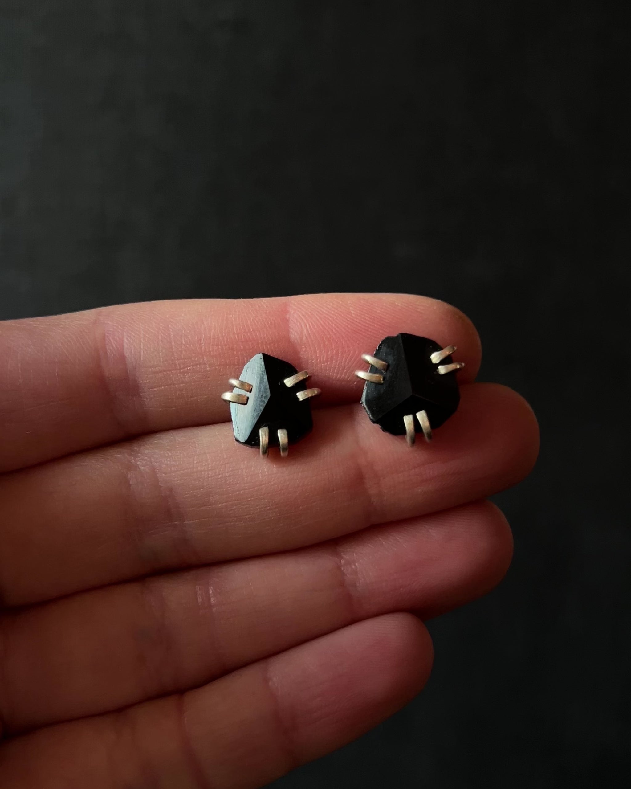 These stud earrings feature natural black tourmaline slices, each one irregular in shape and unique in form. The stones are held by three pairs of fine silver claws, keeping the setting minimal while letting the raw edges remain visible. Graphic yet organic, they feel grounded and quietly bold. Designed as everyday studs with character.