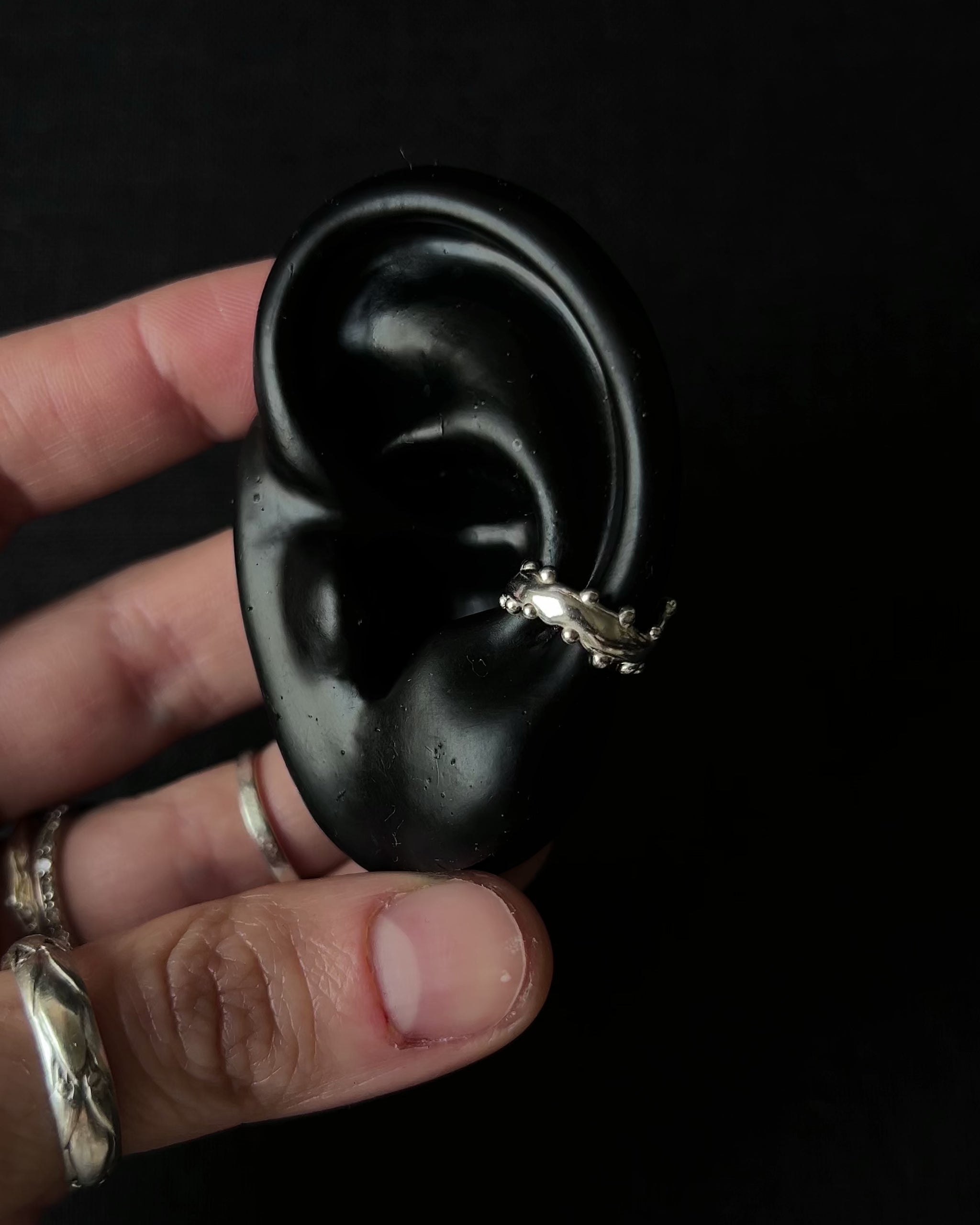 A continuous line of silver dotted all the way around, echoing the rhythm of the Navi Contour ring. Subtle yet distinctive, it wraps the ear with quiet texture and balance. Designed to be worn alone or layered, no piercing needed.