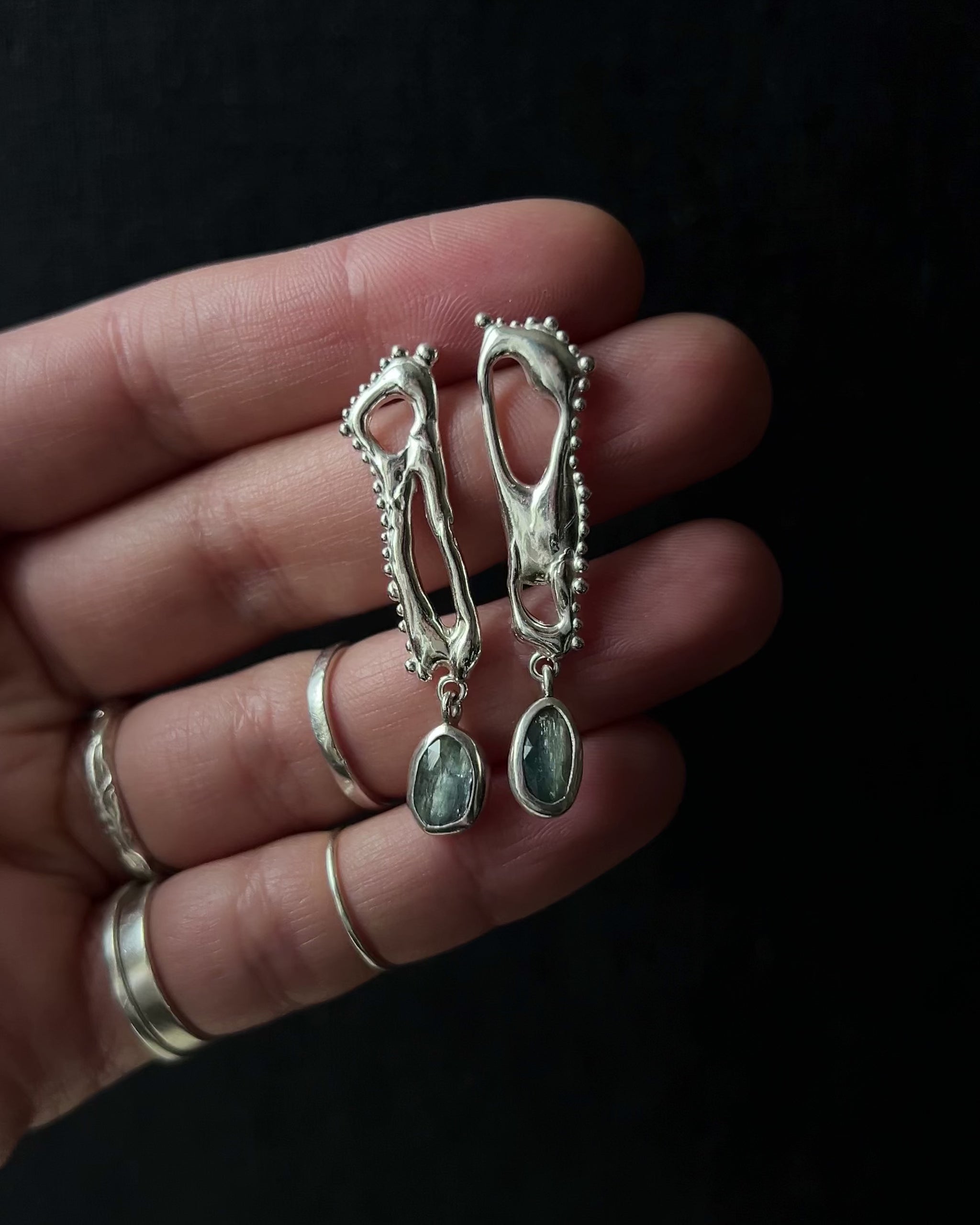 Elongated, molten lines meet cool blue kyanite, blending raw metal with quiet, luminous energy.