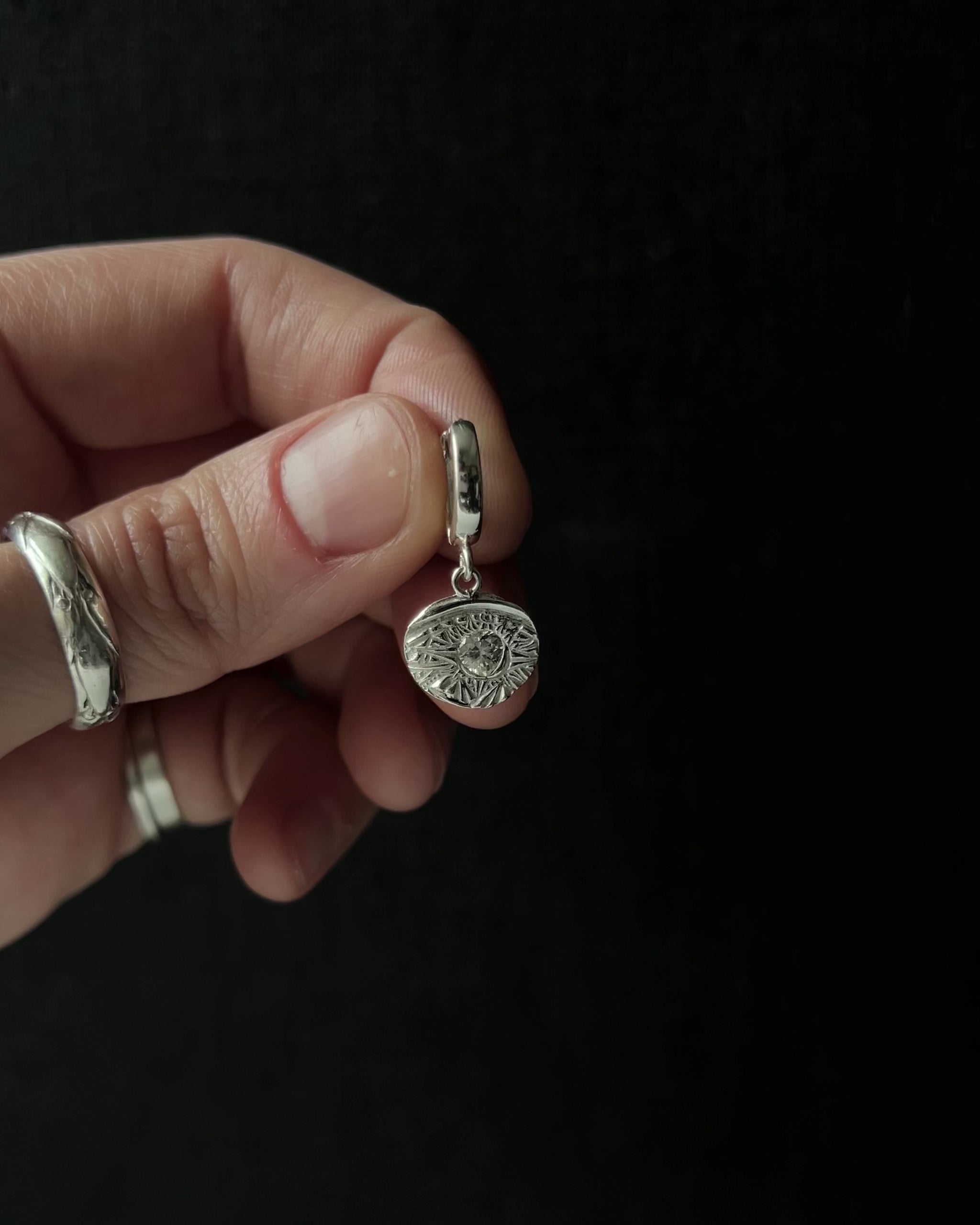 These hoop earrings are designed to be worn as singles or paired together to create your own combinations. Each dangle has its own character, allowing you to mix textures, moods, and symbols depending on how you wear them. Subtle on their own, expressive when combined.